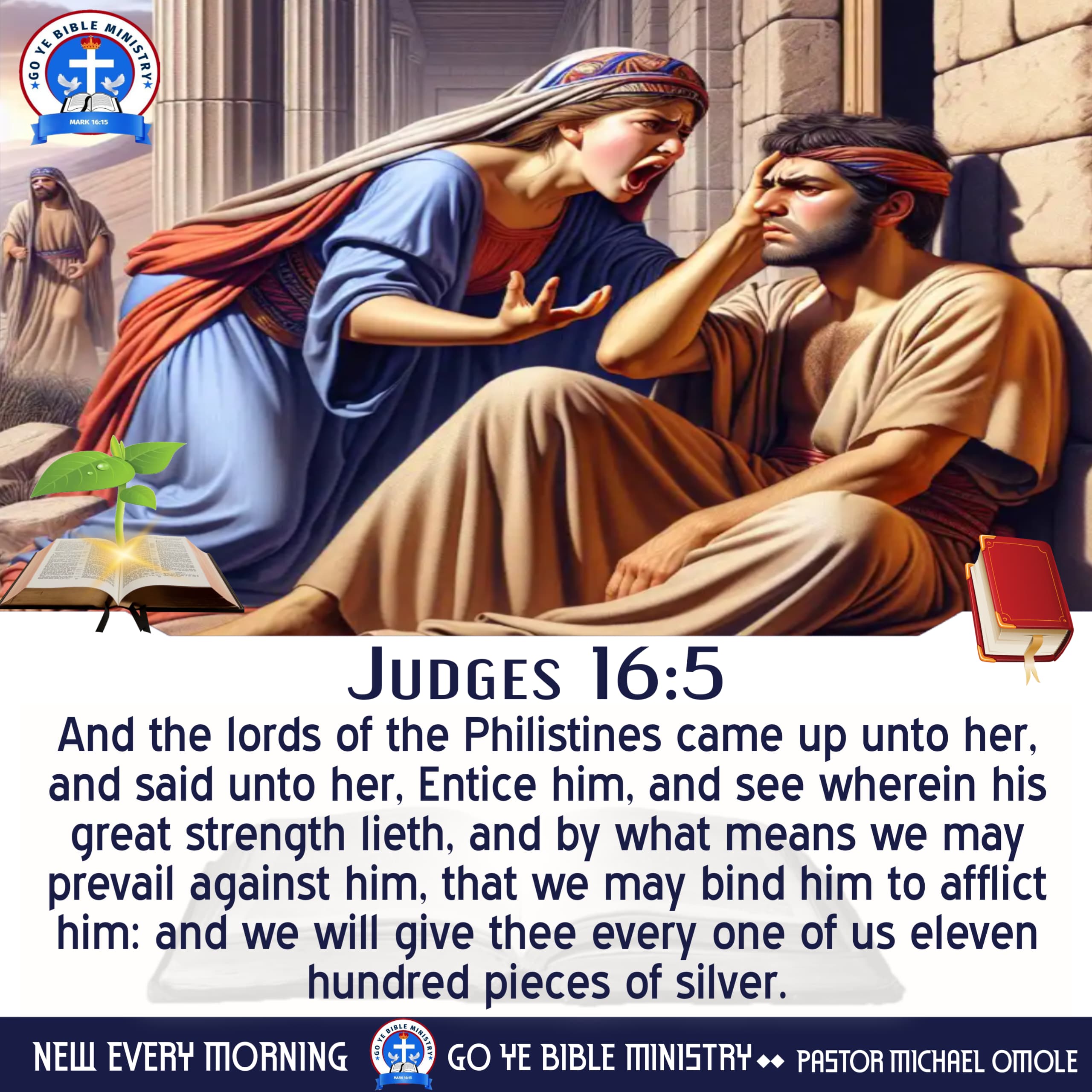 KEY VERSE: The rulers of the Philistines went to her and said, “See if you can lure him into showing you the secret of his great strength and how we can overpower him so we may tie him up and subdue him. Each one of us will give you eleven hundred shekels of silver.” (V. 5)